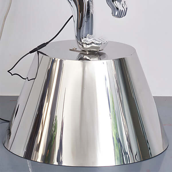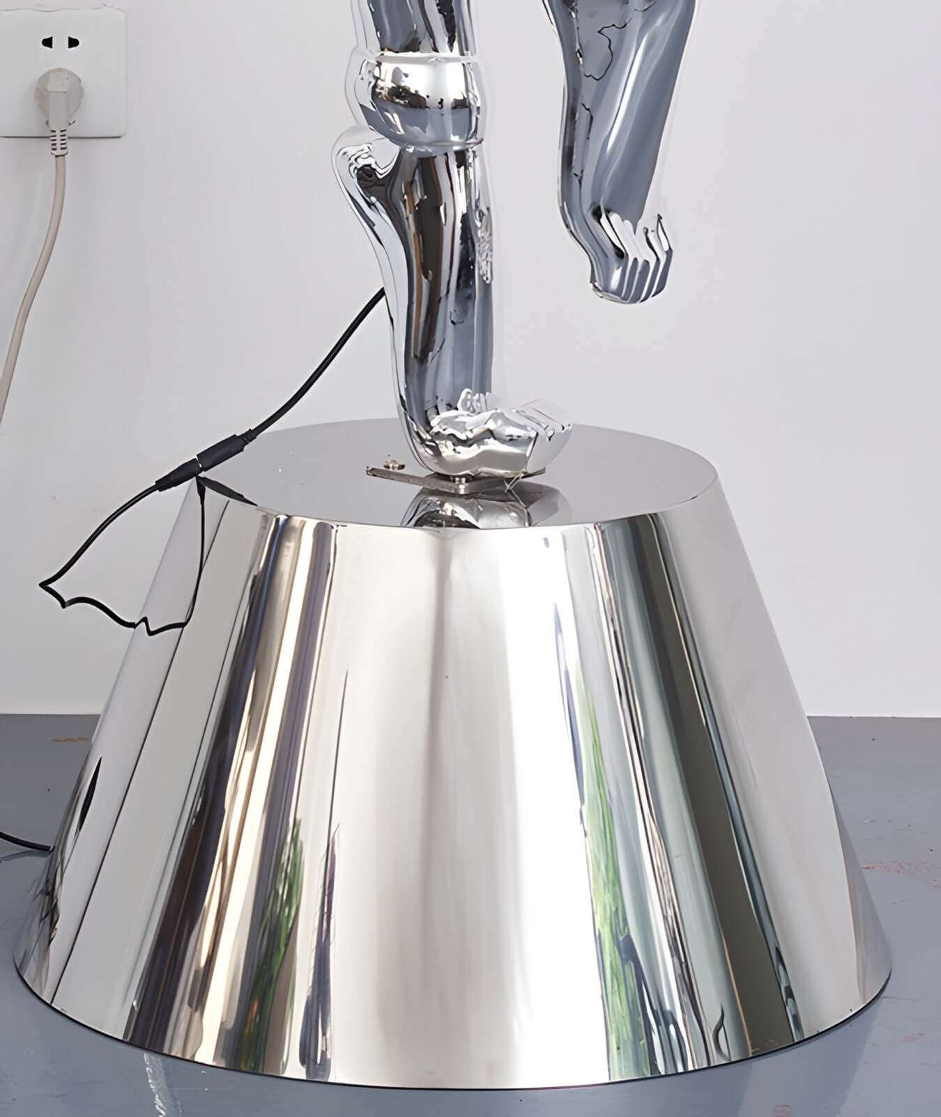 Sculptural silver floor lamp resembling a mannequin, perfect for trendy living room decor in art deco style.