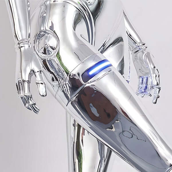 Close-up of a reflective silver robot leg with blue light detail, showcasing futuristic design and sleek metallic finish.