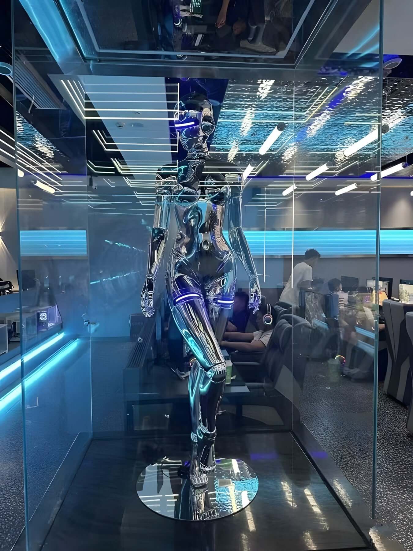 Sleek chrome robotic sculpture displayed in a modern glass case with blue LED lighting.