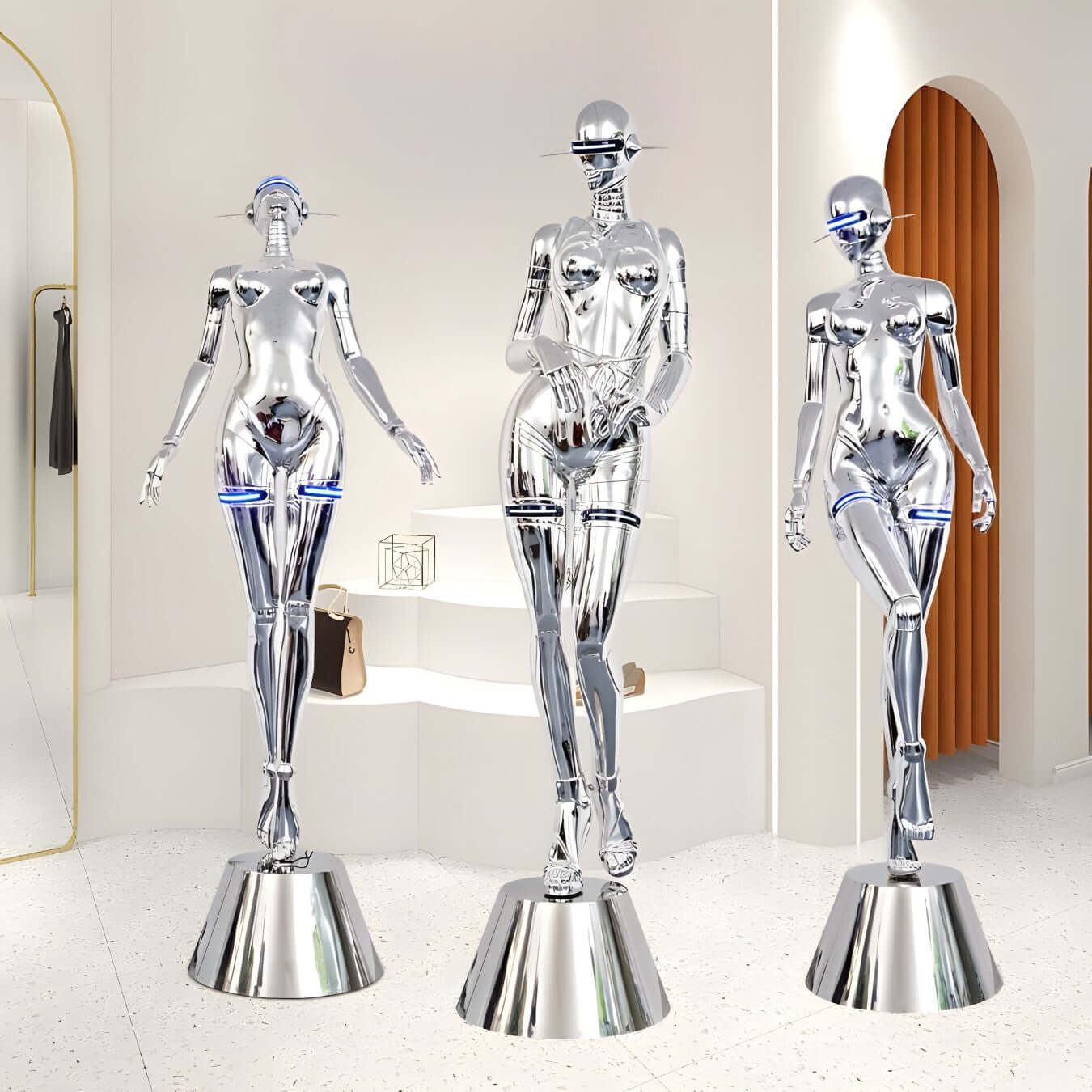 Sculptural chrome mannequins on sleek bases in a modern interior, showcasing contemporary design and elegance.
