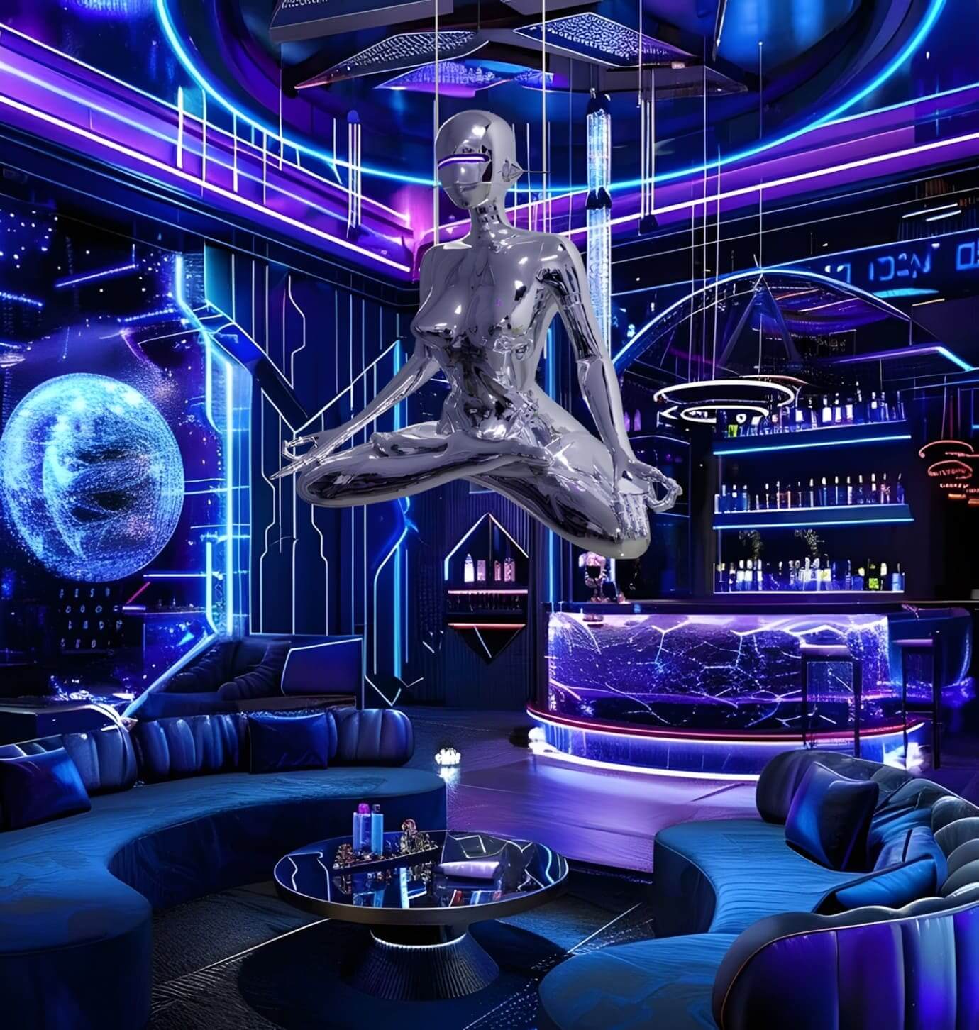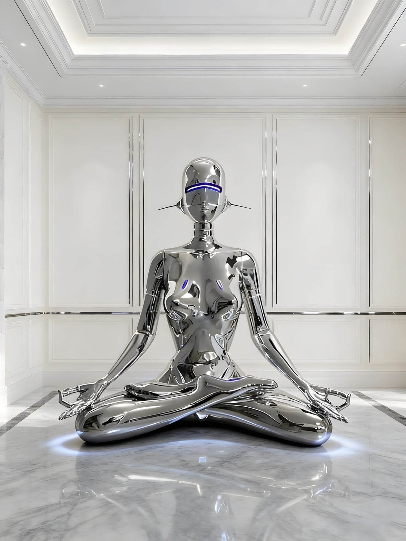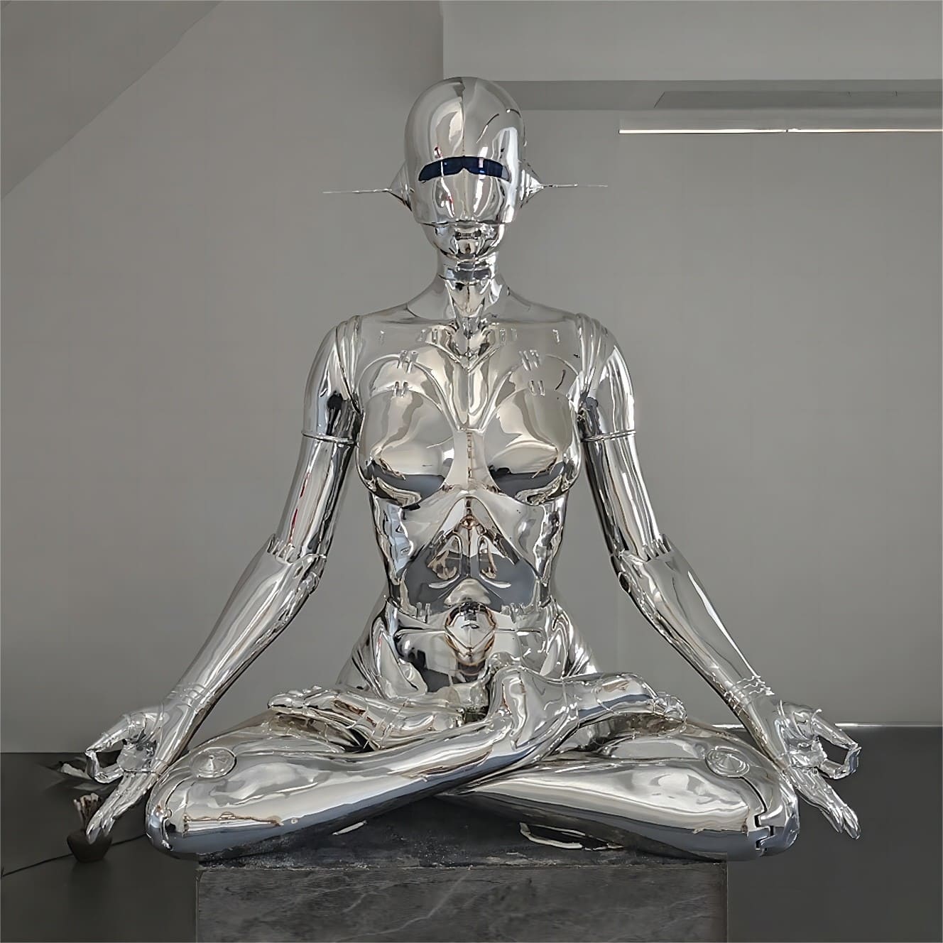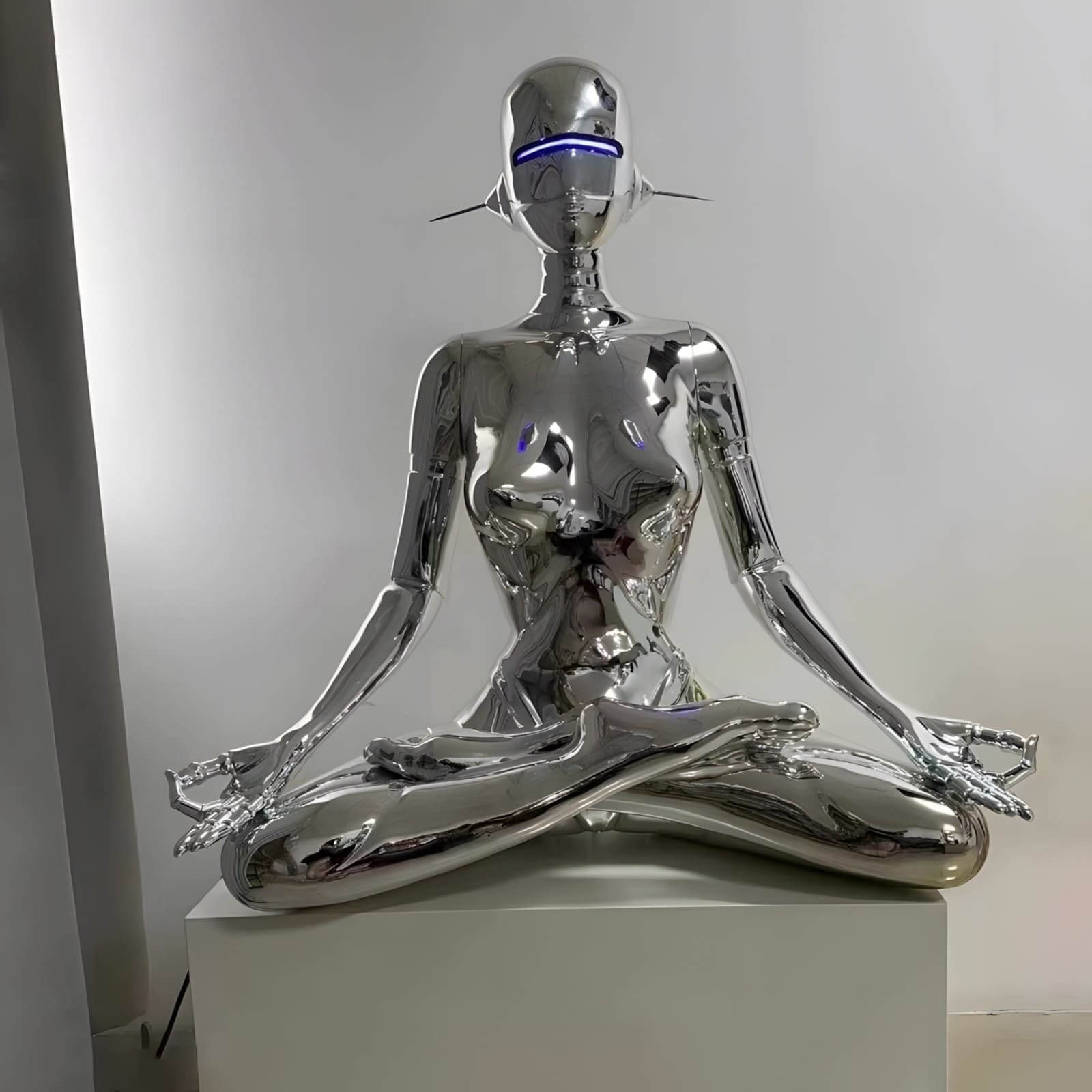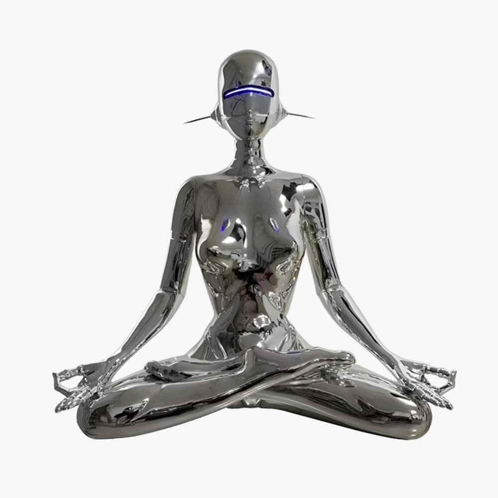 With its meditative pose and sleek chrome finish, this piece blends futuristic design with peaceful, sculptural beauty.