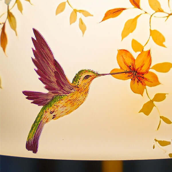 The hand-painted bird and floral glass shade creates a peaceful, nature-inspired ambiance at home.