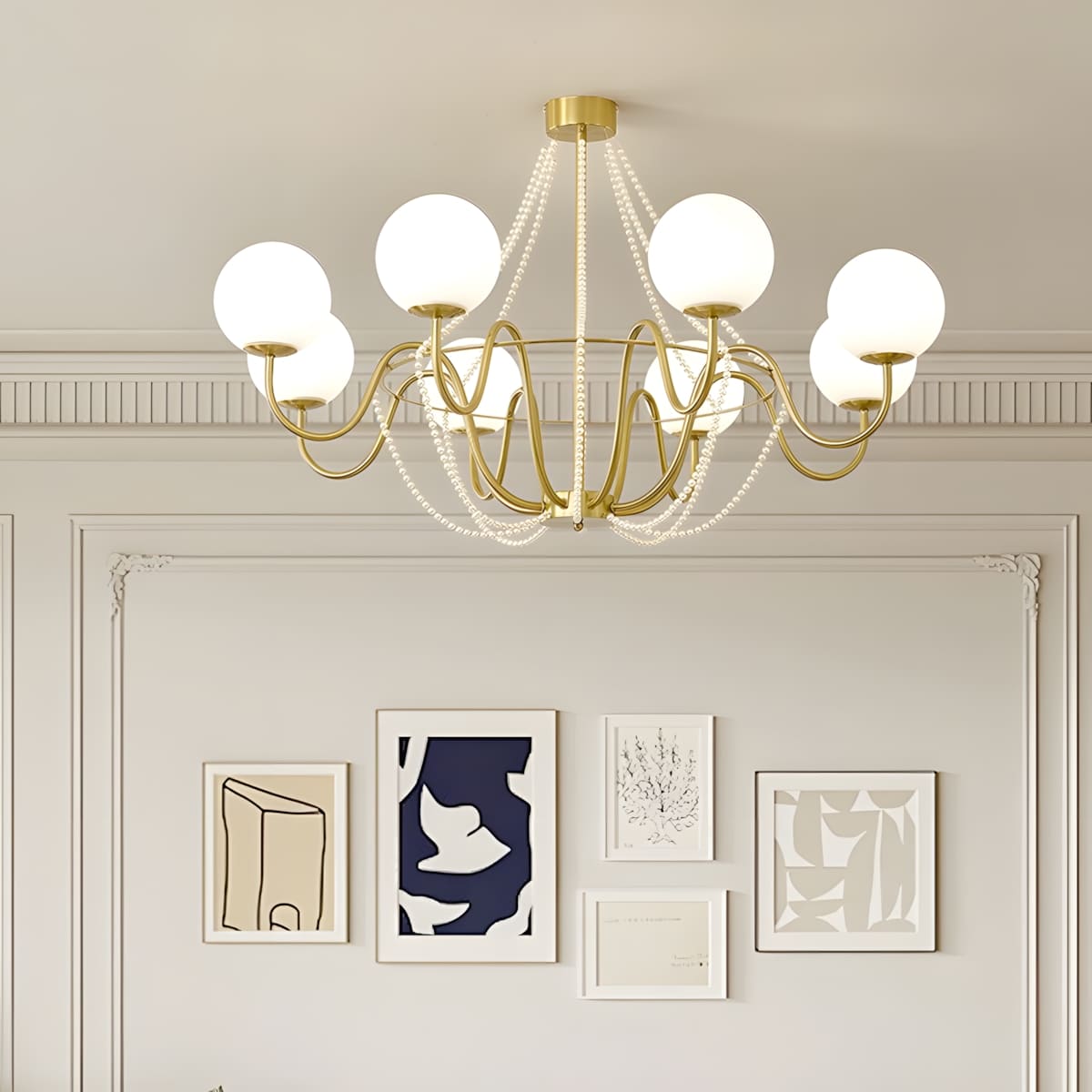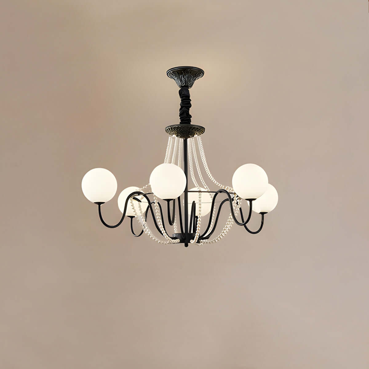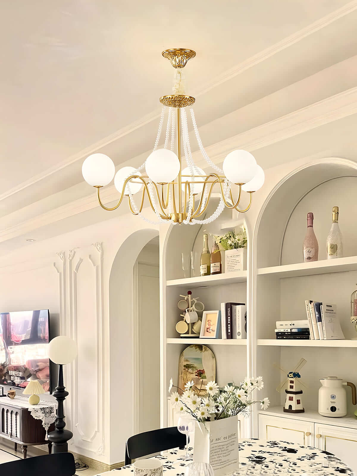 Romantic and refined, the Novera Chandelier brings soft illumination and vintage beauty to your space. The delicate glass shades and pearl embellishments add a luxurious touch, perfect for cozy bedrooms, refined living rooms, or artistic restaurant corners.