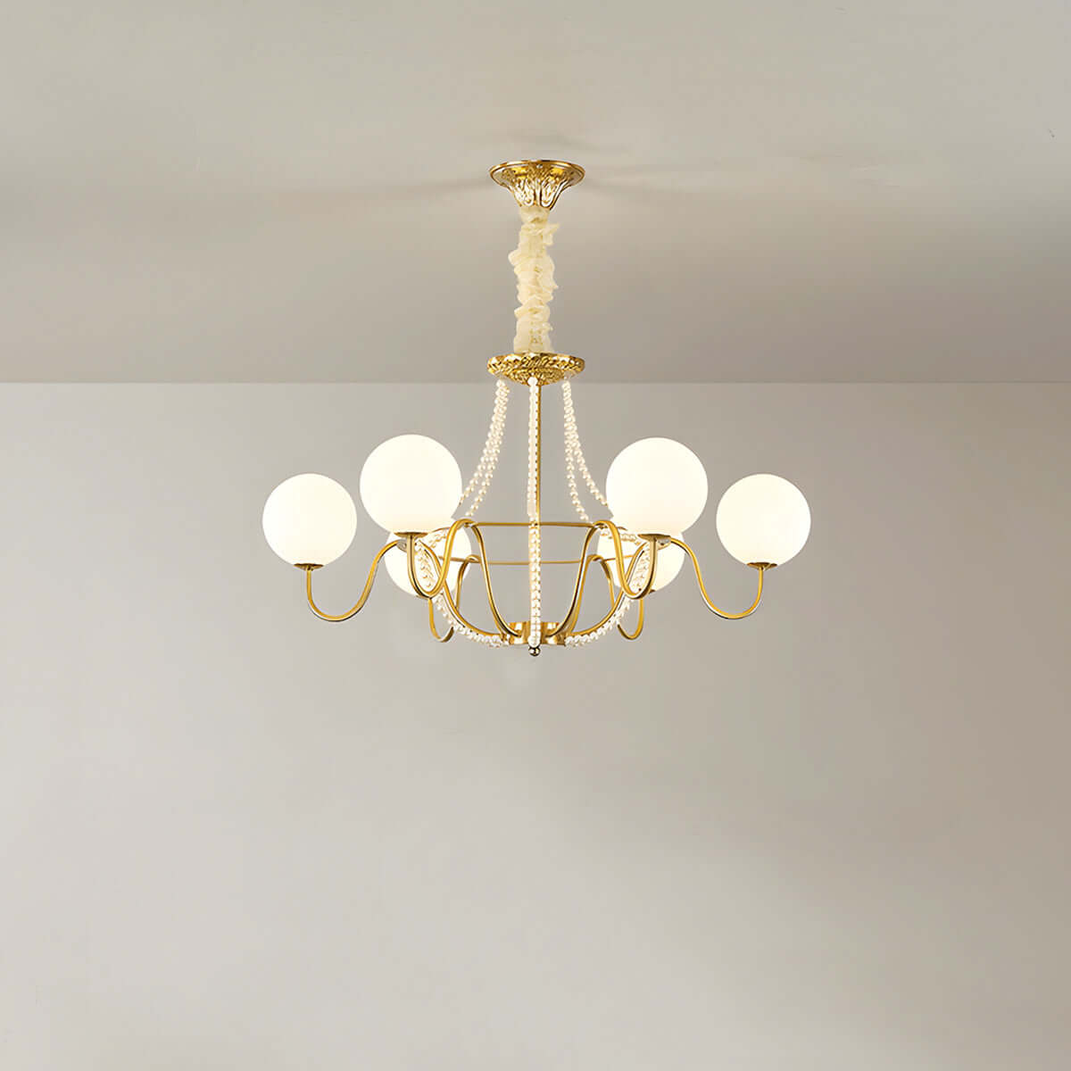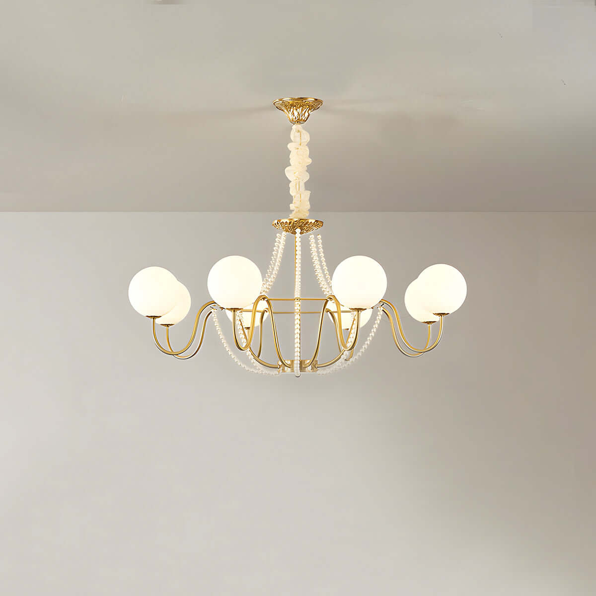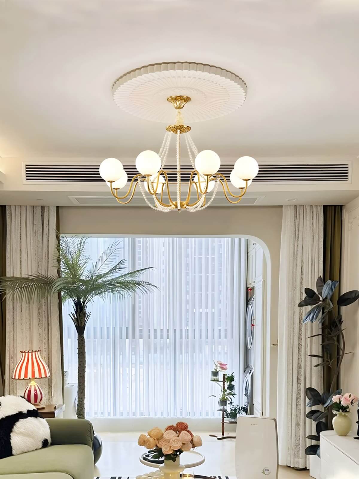 Romantic and refined, the Novera Chandelier brings soft illumination and vintage beauty to your space. The delicate glass shades and pearl embellishments add a luxurious touch, perfect for cozy bedrooms, refined living rooms, or artistic restaurant corners.