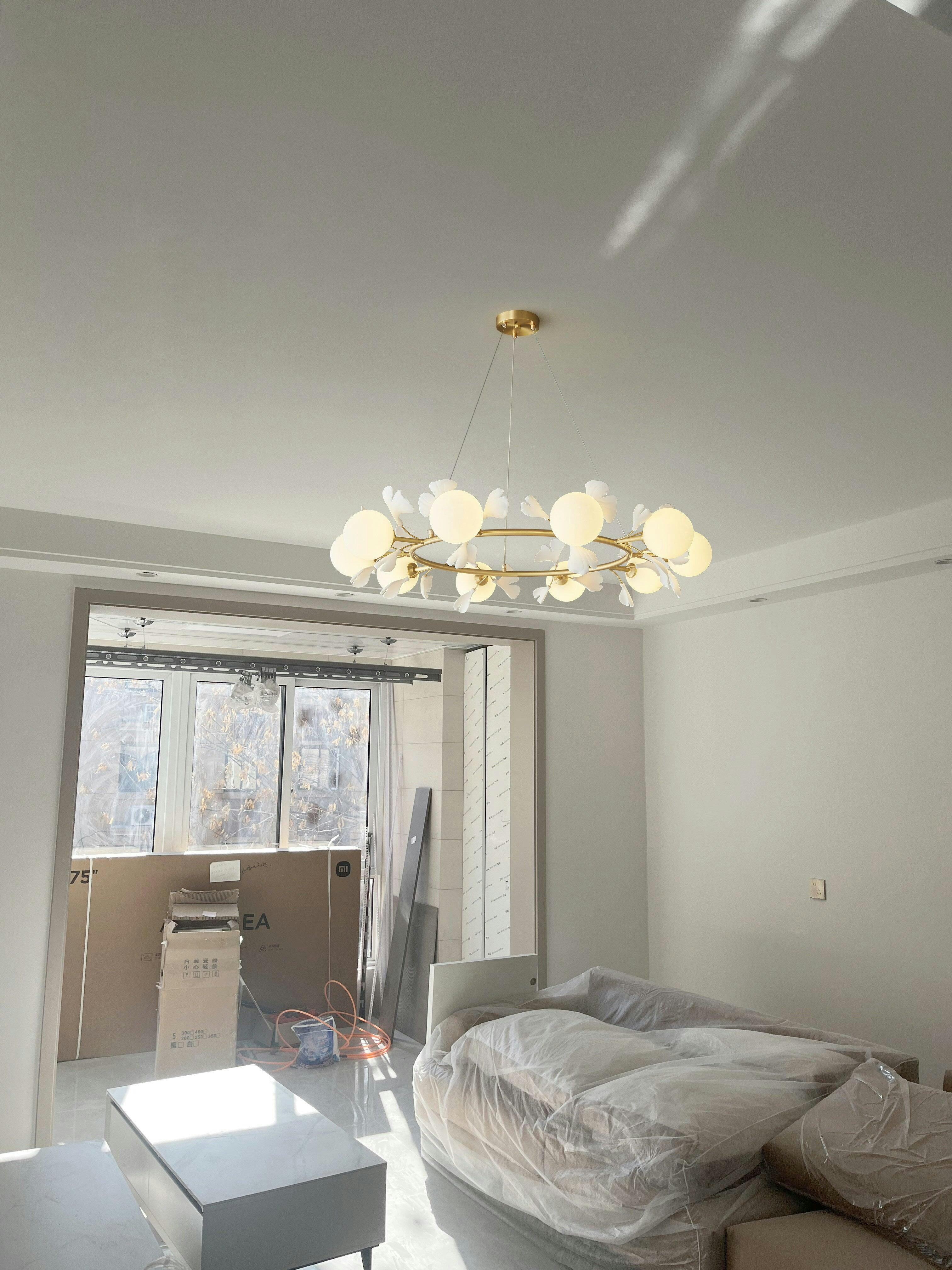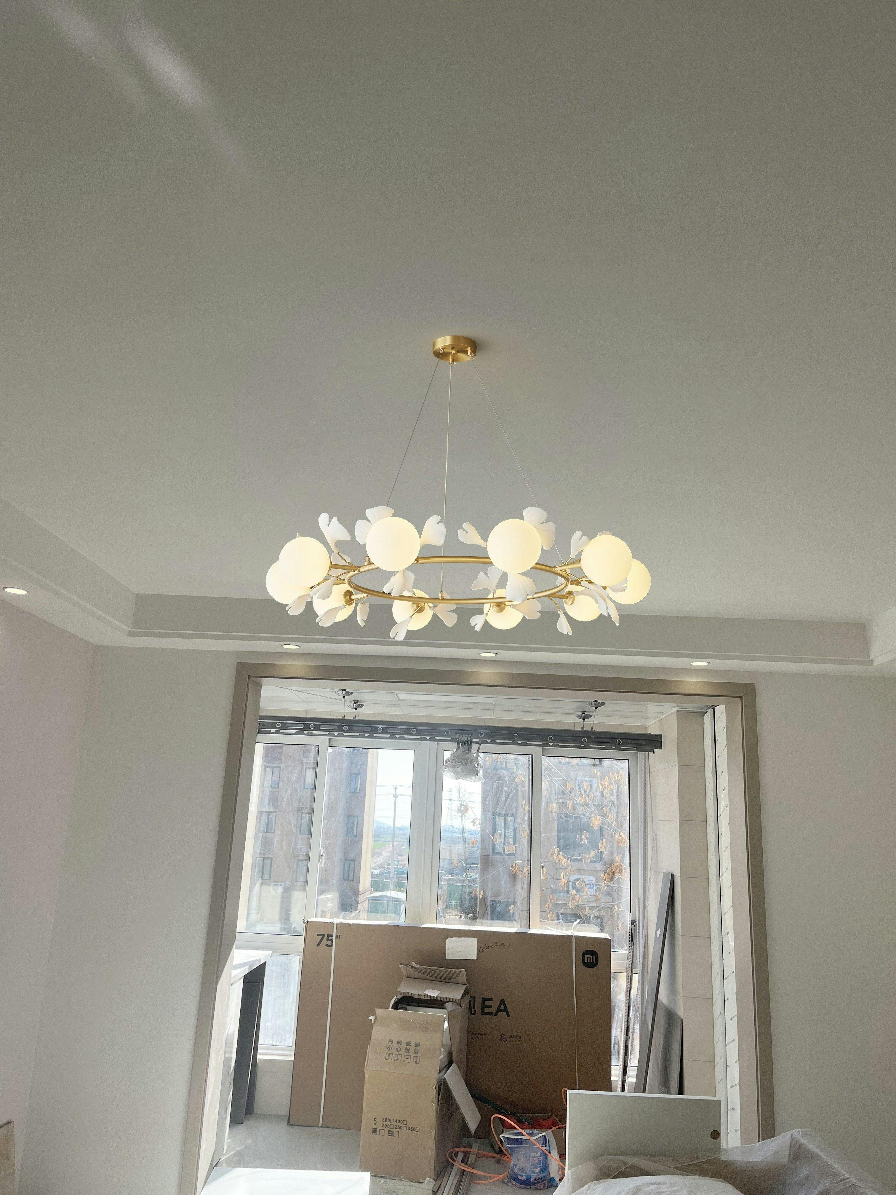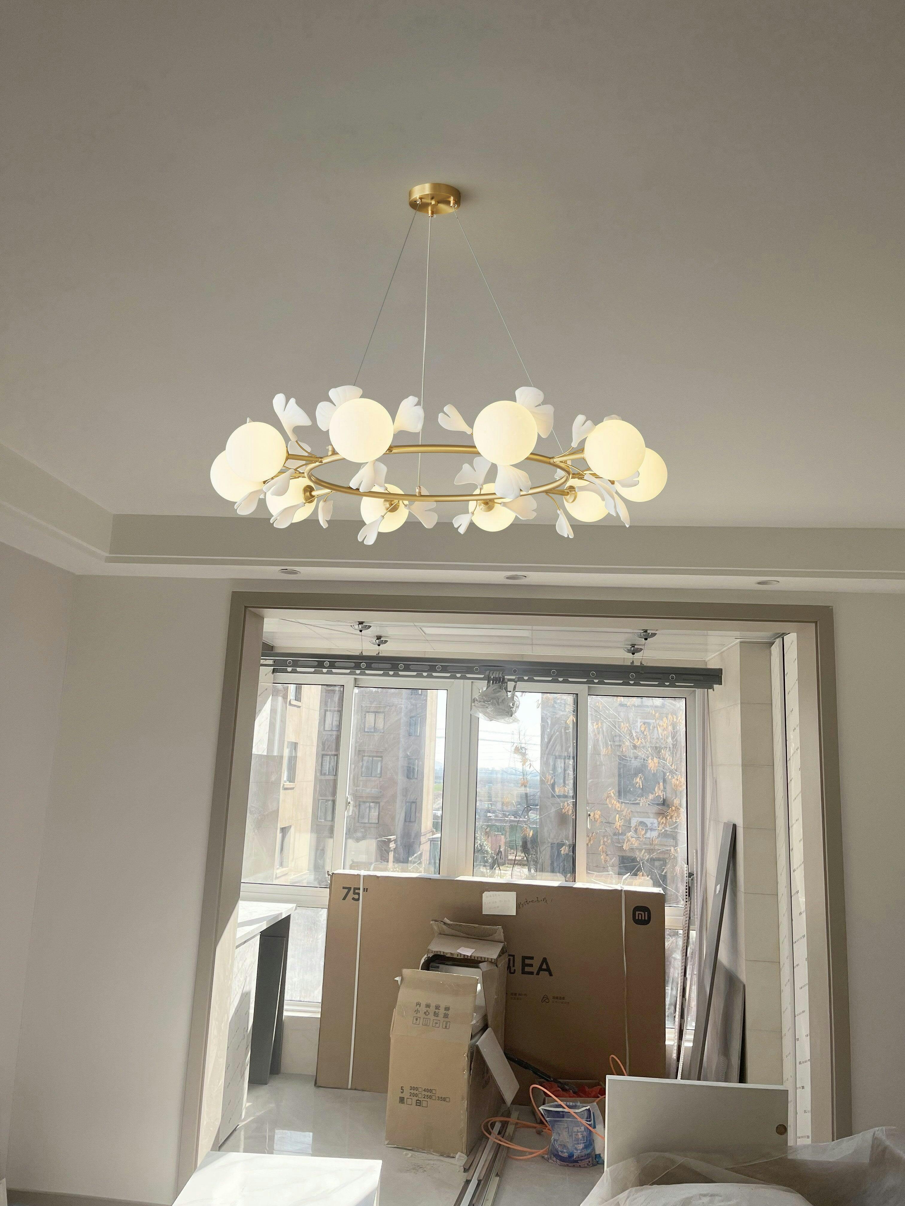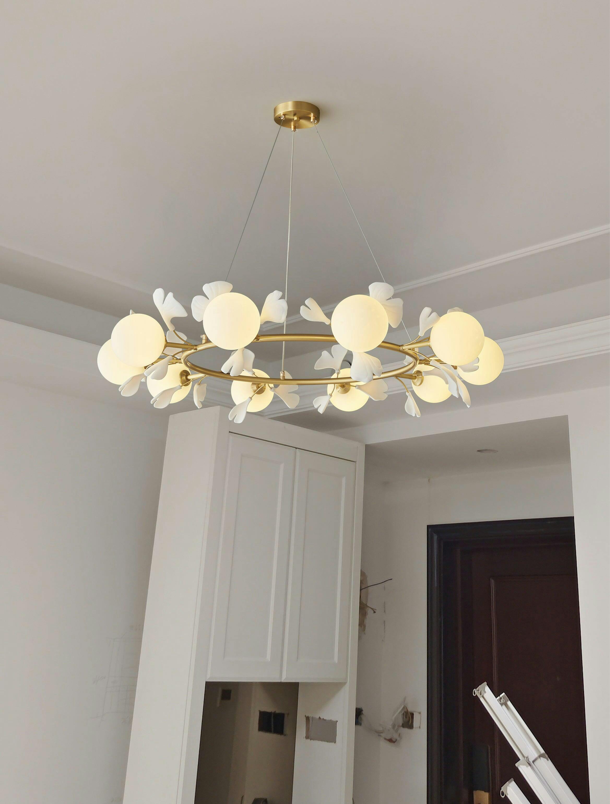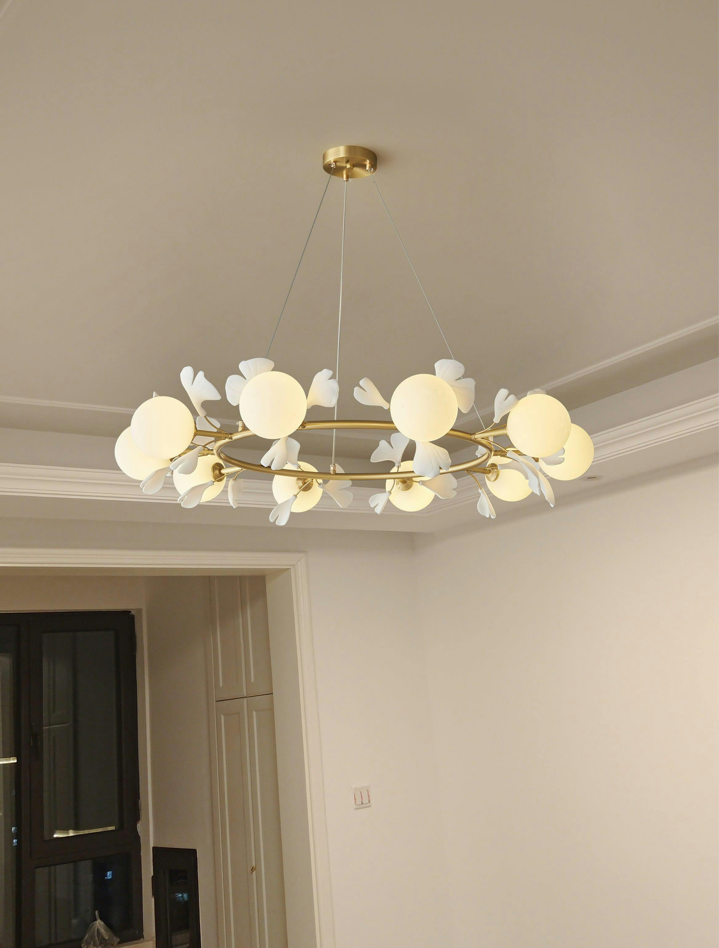The Rosalia Ginkgo Chandelier blends modern elegance with natural charm. Inspired by ginkgo leaves, its luxurious golden frame and round lampshades create a harmonious ambiance. Crafted with meticulous attention to detail, this chandelier is a stunning addition that combines beauty with durability.