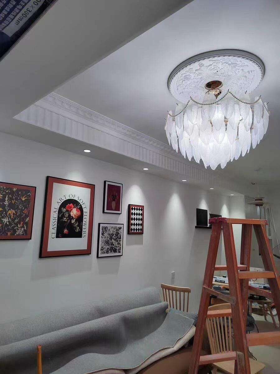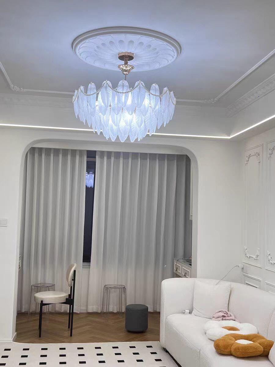 Transform your home with the Staklo Chandelier โ€” a breathtaking piece crafted from elegant glass feathers, gleaming brass, and delicate pearls. Its soft ambient glow makes it a perfect statement for your living room, dining area, or bedroom, blending modern charm with vintage grace.