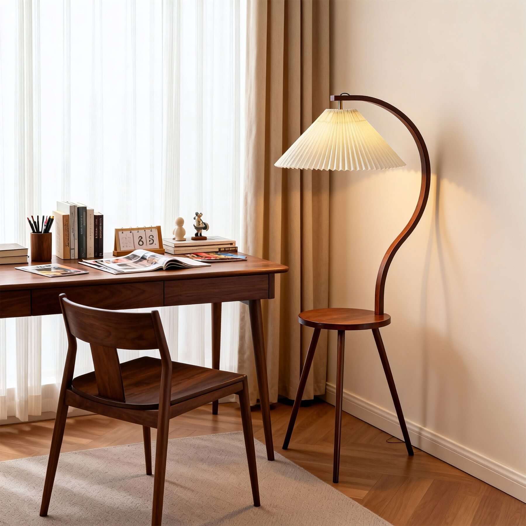 This modern Nordic floor lamp blends handcrafted fabric and natural wood in a sturdy tripod design. A pleated shade softens the light, while the compact round shelf adds creative storage. Perfect for corners, it enhances minimalist décor with warm ambience and fashionable practicality, bringing a cozy, polished touch to any living space.