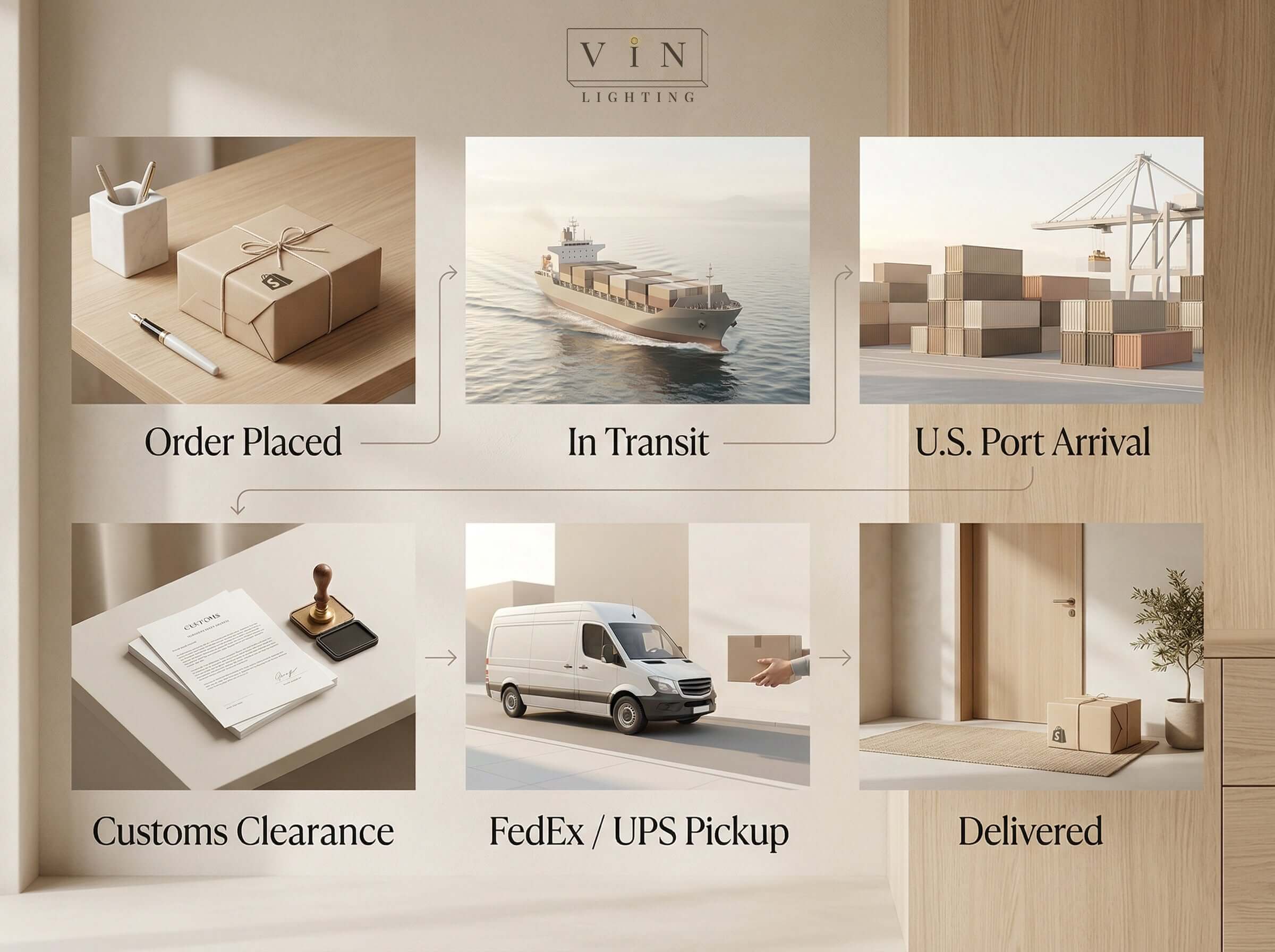 Order Placed → In Transit → U.S. Port Arrival → Customs Clearance → FedEx / UPS Pickup → Delivered