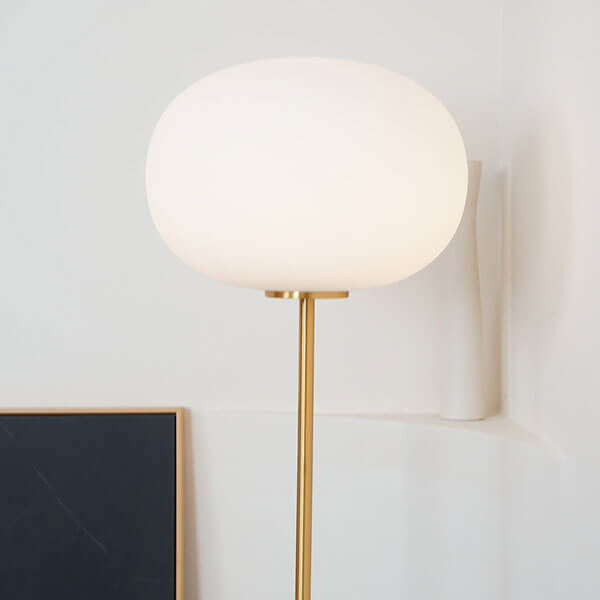 Modern floor lamp in living room, featuring a round glass shade and a stylish base for a cozy reading nook.