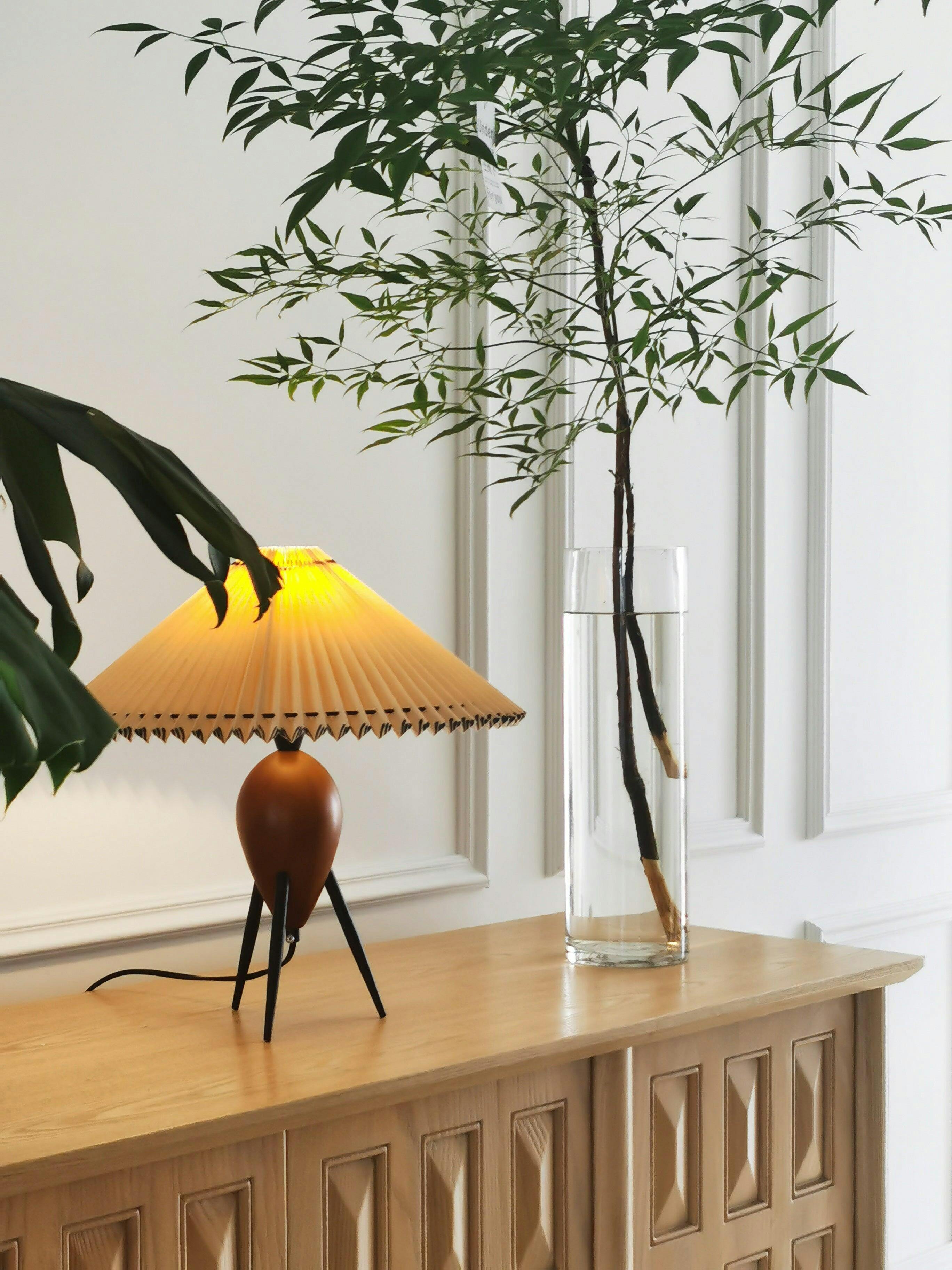 Makie Table Lamp in wood and fabric design on a console, perfect as a stylish tripod table lamp for any home.