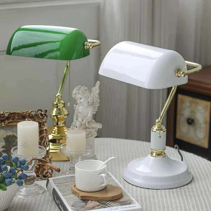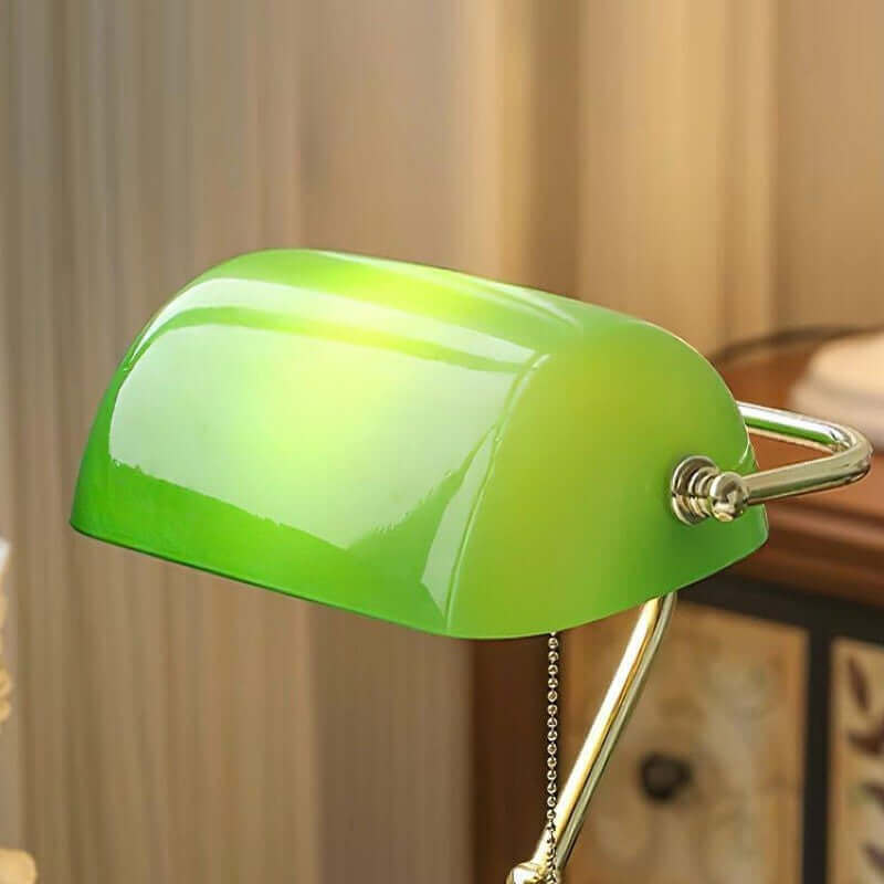 - Vintage Style: A timeless metal base paired with a classic green glass shade, blending old-world charm with modern function.
