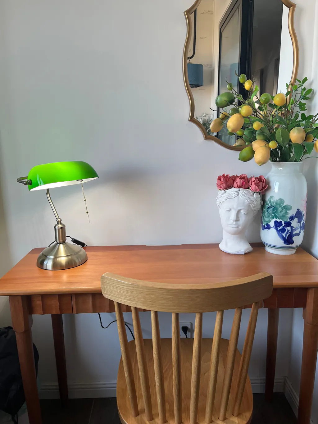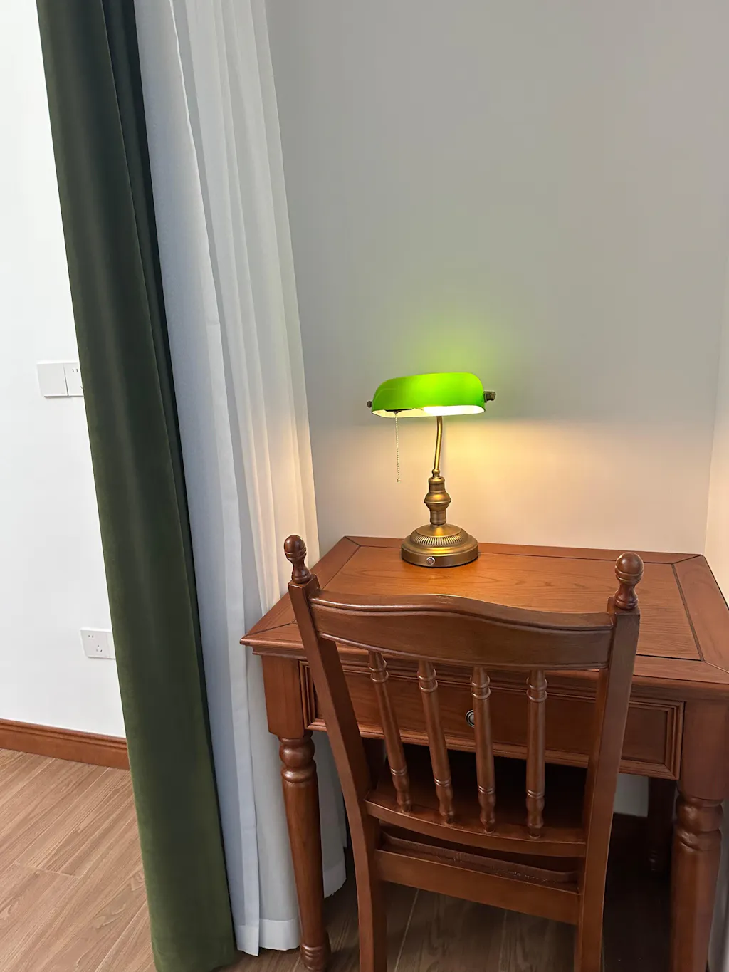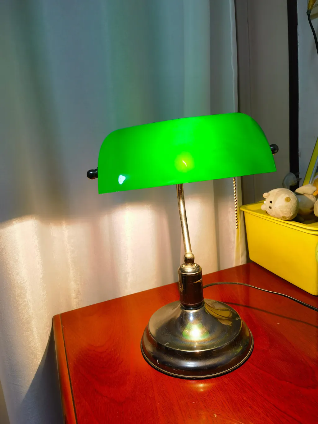 • Vintage Style: A timeless metal base paired with a classic green glass shade, blending old-world charm with modern function.