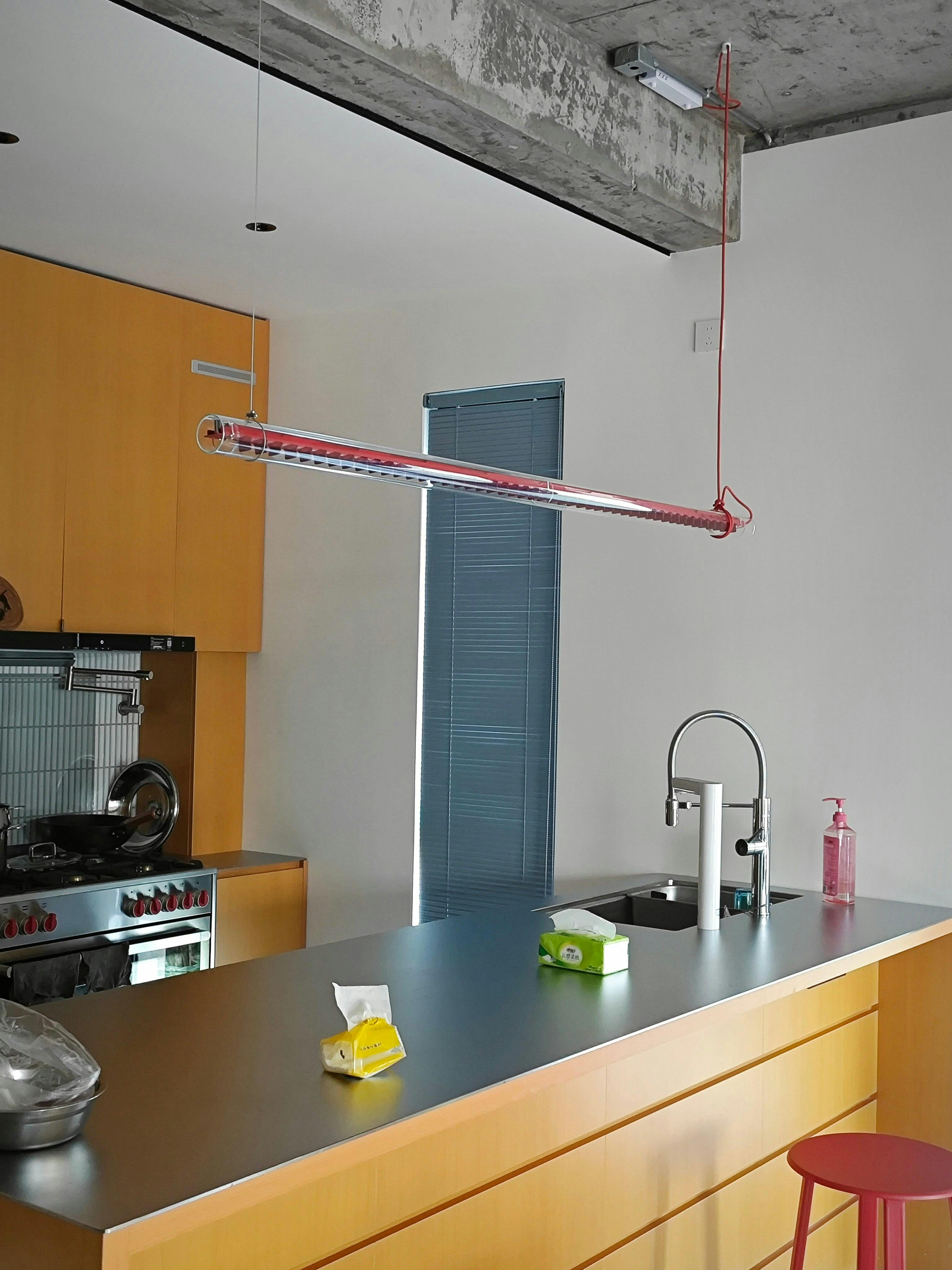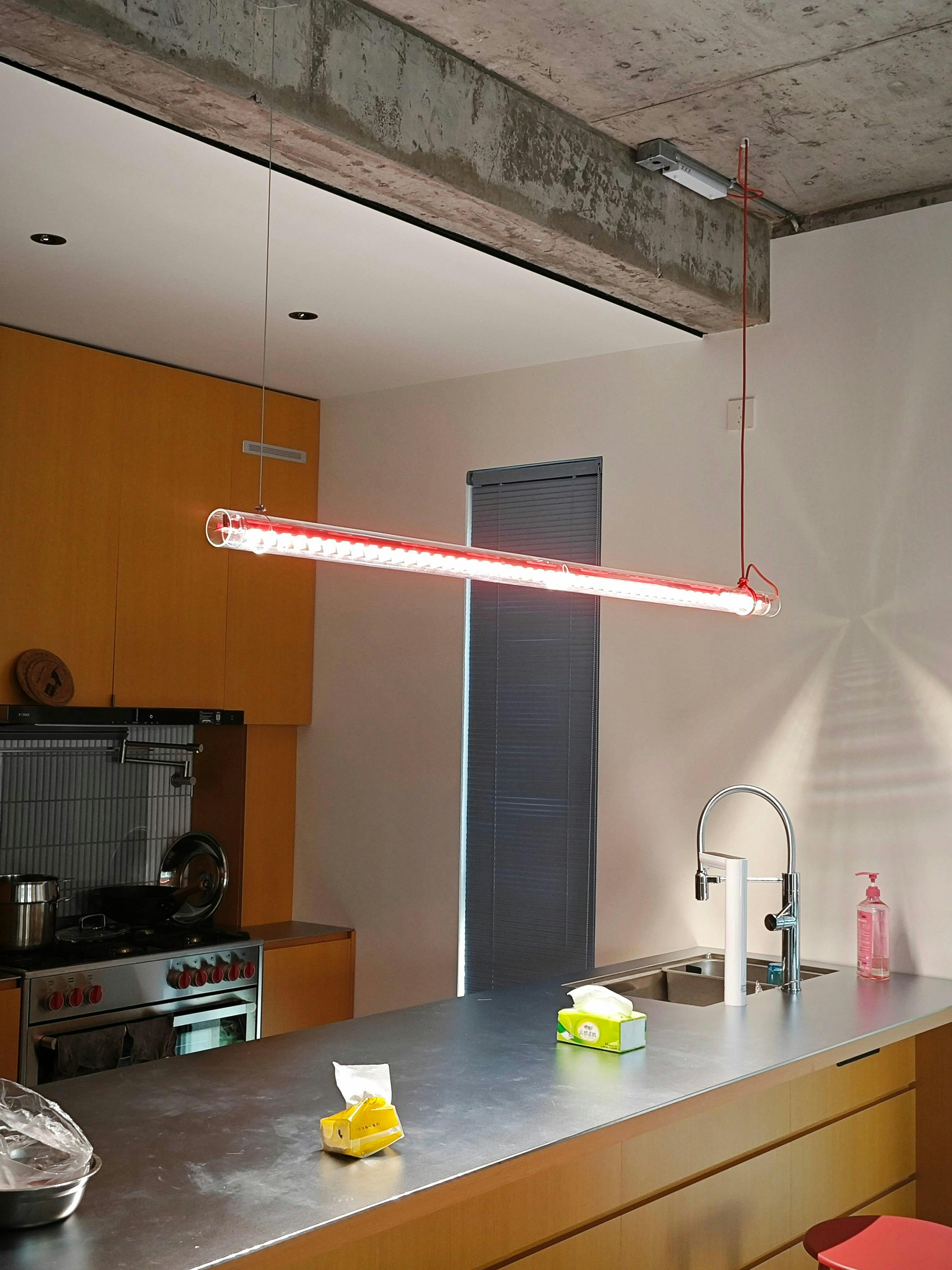 Clear glass tube paired with red fins delivers a bold, art-inspired statement in any modern space.